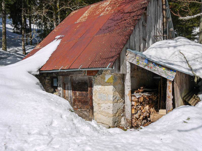 Cependant, prendre une variante par le Pré Gervet permet de découvrir la belle grange bien restaurée avec son appentis garni de bois de chauffage et son fronton fleuri de quelques peintures printanières – un rêve qui le restera. La cabane privée est fermée.