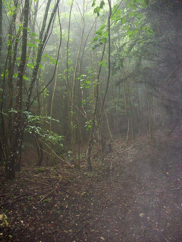 Le brouillard épais dans la forêt ajoute une touche mystérieuse à l'ambiance sauvage – photographie Philippe Mahieu (Avant Pays Savoyard, Billième, Savoie - 11/06/09)
