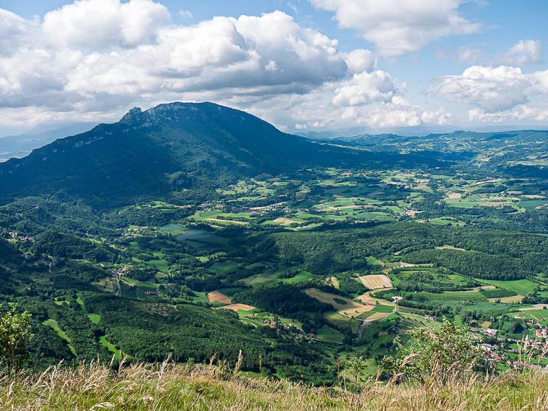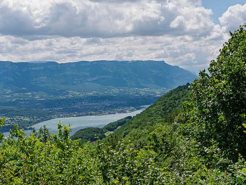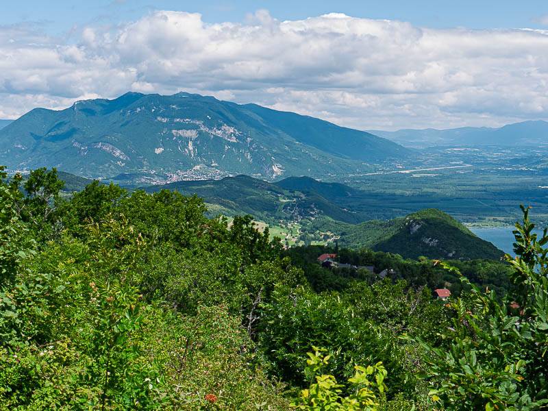 Une courte descente ramène à la bifurcation. La plateforme naturelle de vision m'accueille cette fois sous le soleil et aujourd'hui, les nuages épais n'occultent pas le paysage. Le Mont de la Charvaz séparé du Mont du Chat par le col éponyme retient surtout l'attention. Le Lac du Bourget ne s'aperçoit qu'au travers du col à son extrémité Sud, au Bourget du Lac.
