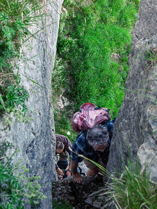 Prendre au-dessus de la cabane des traces qui s'élèvent et disparaissent. Monter légèrement en traversant pour atteindre la base d'une muraille. Bonnes traces qui descendent une cheminée de deux mètres, passent un petit tunnel et vont rejoindre le sentier.