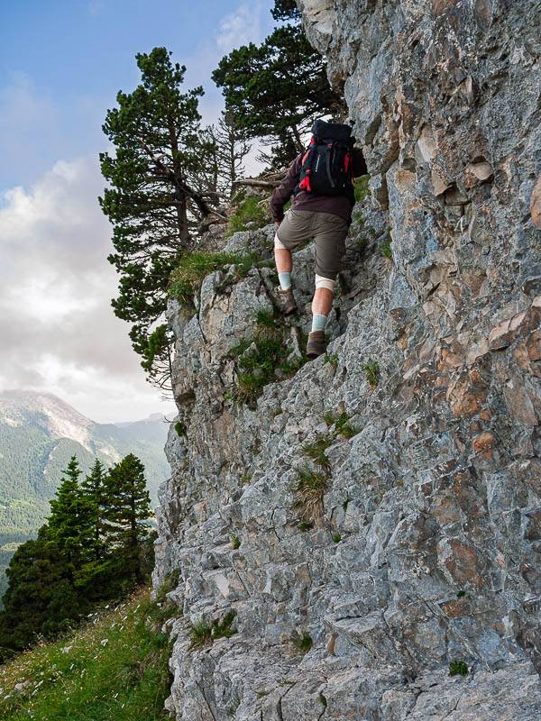 Philippe, filmé par Antoine, est monté le premier. Observant le passage en nous attendant, il remarque deux broches récentes pour s’assurer. Les pitons m'avaient échappé l'autre fois. Le Pas du Lapin est donc sécurisé – par qui ? Montant vers l'Est dès la sortie du pas, nous manquons le cairn situé quelques dizaines de mètres plus au Nord, qui marque le passage [ 31T 0717949 5018015 ]. Chamechaude est dans les nuages, le temps devient menaçant… Nous renonçons à rejoindre directement la Folatière, départ d'autres explorations, pour faire le tour par le bord des falaises jusqu'à la Brèche Arnaud.