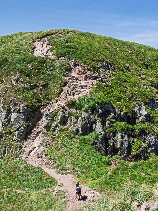 À la montée ou à la descente, les escarpements sont faciles et l'exposition est réduite. Celui de l'Ouest, plus rocheux n'offre pas de difficulté, même s'il faut utiliser les mains. Il y a de plus en plus de monde. Quand approchant, la foule se dessine sur le ciel, telle une ribambelle de personnages en contre jour au sommet du Puy Mary, je décide de rejoindre la route du Pas de Peyrol évitant le dernier sommet du parcours. Devenu Grand Site de France en 2006, c'est l'un des sites les plus visité d'Auvergne… Le téléphone portable est finalement une belle invention ! Madame viendra me récupérer sur le macadam.