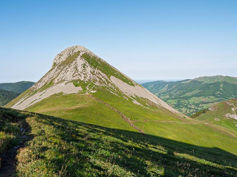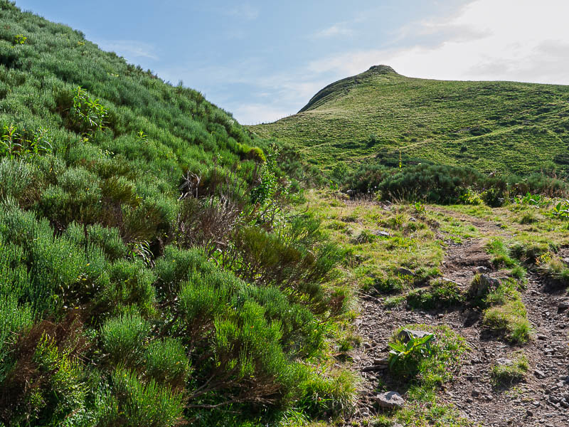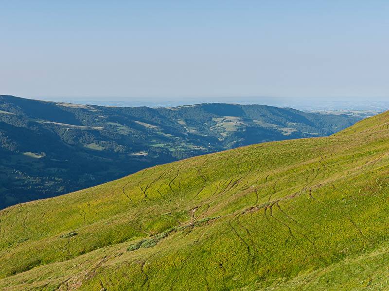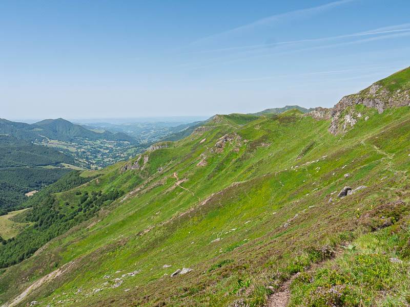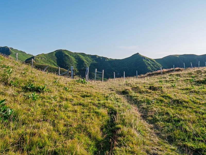 Sans monter jusqu'à la crête, on prendra un vieux sentier sans balisage à gauche. Le terrain dégagé – j'aurais tendance à écrire alpage mais ici, on dit simplement montagne – offre maintenant une vue panoramique splendide qui permet de découvrir une partie du projet d'itinéraire. Après avoir franchi une clôture, le sentier continue à flanc de montagne avant de s'orienter vers le Sud Ouest en direction du cône du Puy Griou.