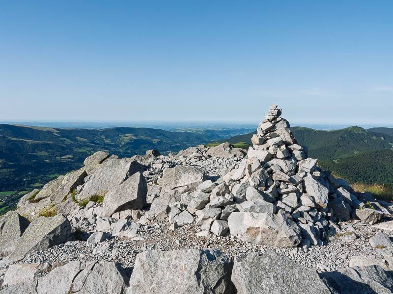 Deux cairns marquent le sommet du Puy de Griou. Du cairn Est, l'horizon est une vraie ligne au Sud Ouest…(Auvergne, Saint-Jacques-des-Blats, Cantal - 21/07/09)