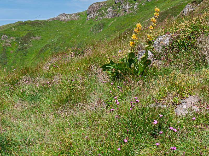 Belles gentianes jaune et oeillets sauvages sur les pentes du Puy de Peyre Arse (Auvergne, Saint-Jacques-des-Blats, Cantal - 21/07/09)
