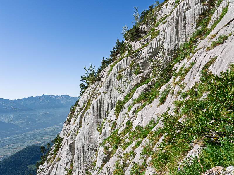 Traversant une zone de pins brûlés lors d'un incendie pendant la canicule de 2003, le point coté 1830m s'atteint sans difficulté – l'occasion de récupérer. Le temps clair garantit une vue exceptionnelle sur les falaises vers le Fourneau et le Grand Manti, le Grésivaudan, Belledonne et au Nord, la vallée de l'Isère ornée du Mont Blanc à l'horizon.