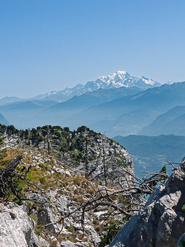 Le Mont Blanc à l'horizon, vu au travers des Pins Brûlés des Rochers de la Rousse (Chartreuse orientale, Sainte-Marie-du-Mont, Isère - 06/08/09)