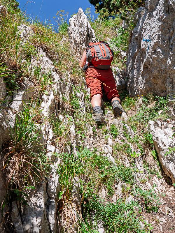 Le sentier se poursuit au dessus longeant la paroi. Il franchit un ressaut et revient à gauche (Sud-Ouest) jusqu'à l'angle entre la paroi et la pente très raide mi-rocheuse, mi-herbeuse. Attaquer cette dernière entre les dalles grâce à des traces et bonnes marches qui rendent la montée assez facile. Elles grimpent longuement la zone herbeuse le long de la paroi, puis au centre dans le haut.