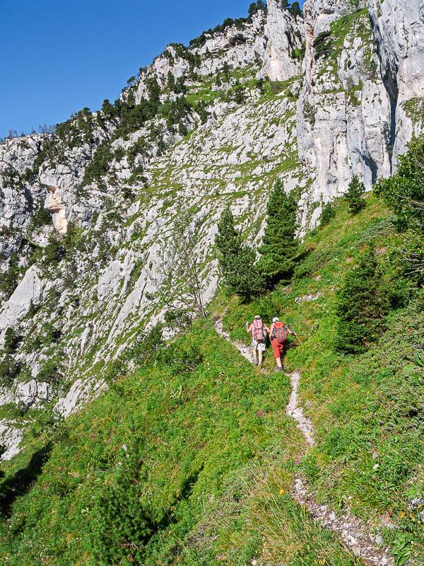 Si les pentes sont toujours aussi raides, la sente offre maintenant un parcours varié, fait de traversées et de passages rocheux faciles dans les gradins herbeux.