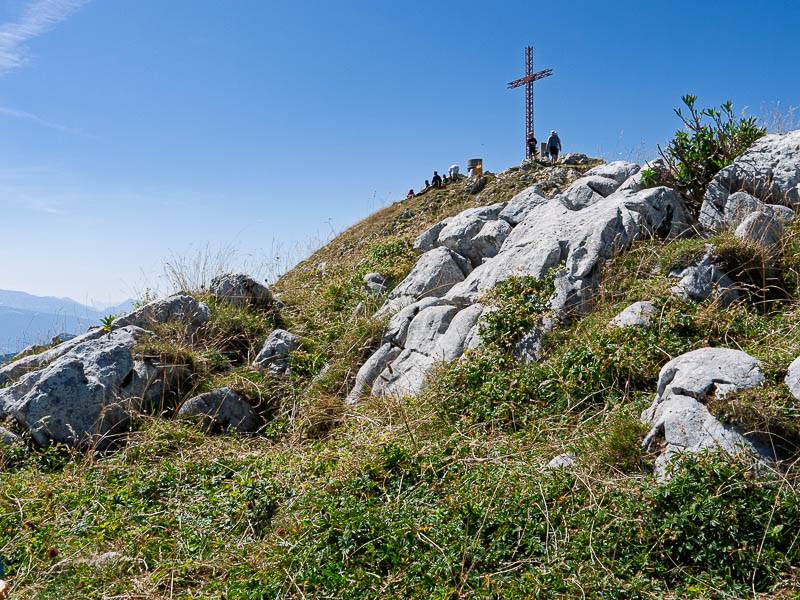 Jusque là, des ressauts masquaient le sommet mais, après un passage de dalles pour monter reprendre pied sur la crête, la croix sommitale se dessine sur le ciel bleu. Des silhouettes s'animent sur la cime.
