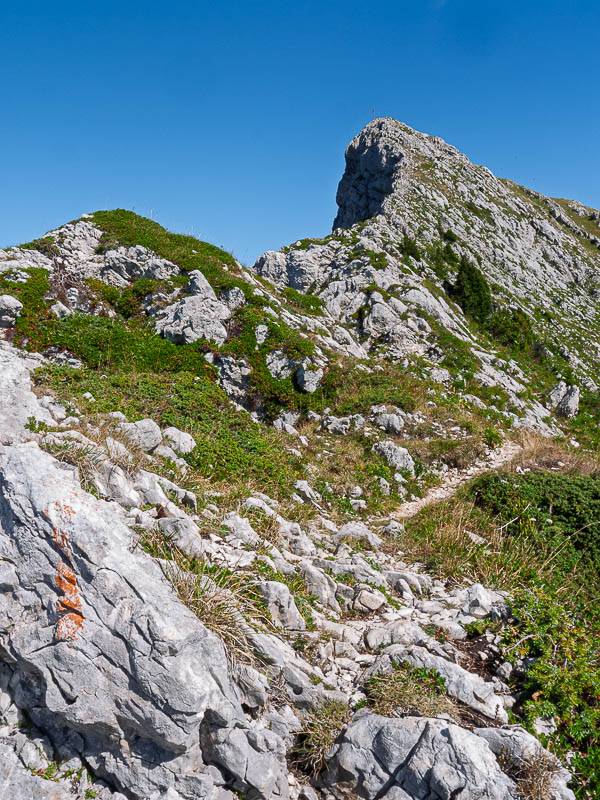 Grimper immédiatement à gauche les rochers et suivre l'arête dans de bonnes traces balisées de flèches rouges jusqu'à la cime.