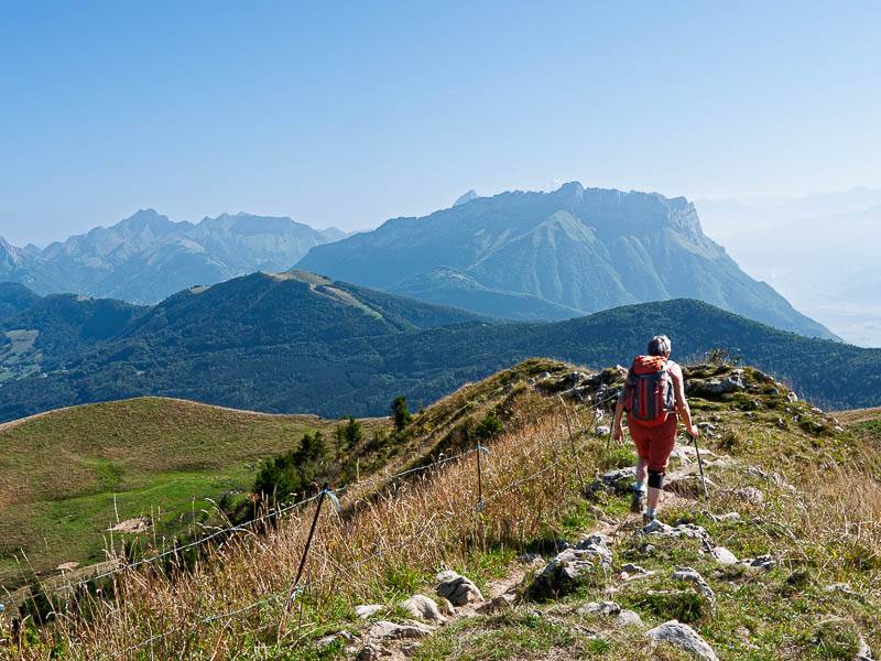 La large arête herbeuse que l'on peut monter en lacet pour casser la pente offre un beau parcours aéré. La vue se dégage progressivement pour offrir de beaux points de vue, un peu dans toutes les directions, la vallée de Chambéry, le Mont Margeriaz et surtout le panorama sur le Nord du massif des Bauges.