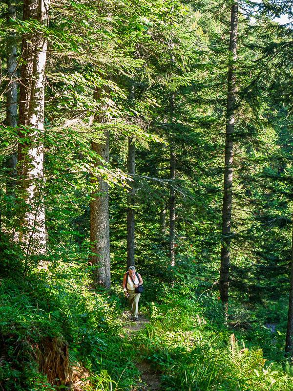 La chaleur au soleil, nous conduit à lever rapidement le pique nique, impatient de retrouver la fraîcheur à l'ombre de la forêt. Vers le Sud, nous quittons bientôt la bonne piste du chalet après son double lacet pour suivre une autre piste moins pratiquée dans la même direction. Laissant un vieux bachat à gauche, le sentier de Penon dévale les pentes raides à droite [ 32T 0272062 5051808 ]. Aux alentours du point coté 1142m, le sentier descend maintenant des pentes plus douces à travers une admirable forêt d'arbres élancés, très hauts – vertige inversé… Encore un peu de dénivelée avant de retrouver au confluent du ruisseau de la Grande Combe avec celui du Lindar, le goudron de la route et la voiture.