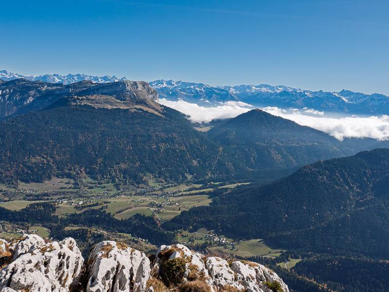 Grenoble et le Grésivaudan sont couverts d'une mer de nuage d'où émergent les sommets du Vercors. Mais dans les autres directions, le temps dégagé et rarement aussi clair, donne au panorama toute sa grandeur. La table d'orientation interne fonctionne bien et, c'est un plaisir de se remémorer les sommets, cols et villages de Chartreuse visible du sommet central bien isolé. Petite reconnaissance de la descente vers Pré Bâtard, quelques prises de vues et sous un petit vent de Nord, il reste à trouver une place confortable à l'abri. pour poser le sac à dos, il n'y a que l'embarras du choix sur ce lapiaz géant…