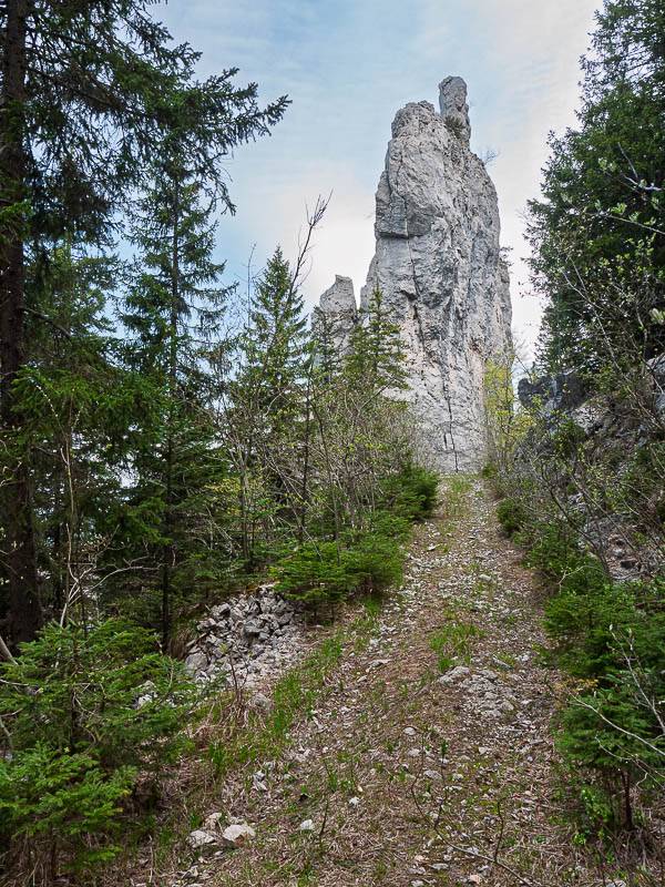 Sans autre documentation que la 1/25000e, une surprise attend le randonneur curieux. Dans le lacet à gauche de la piste – 1270m, [ 32T 0268891 5068207 ] – un poteau du PDIPR indique Château Larron à 5 minutes vers le Nord. Le chemin qui figure sur la carte, long de 500 mètres environ, sans la mention du moindre toponyme, part traverser une zone rocheuse au relief tourmenté quand on y regarde de plus près. Une croix est aussi mentionnée sur la 1/25000e. Tout cela, je l'observerai au retour. Et c'est vraiment une surprise de découvrir l'aiguille de Château Larron, gendarme élancé quand on arrive du Sud-est par le chemin.