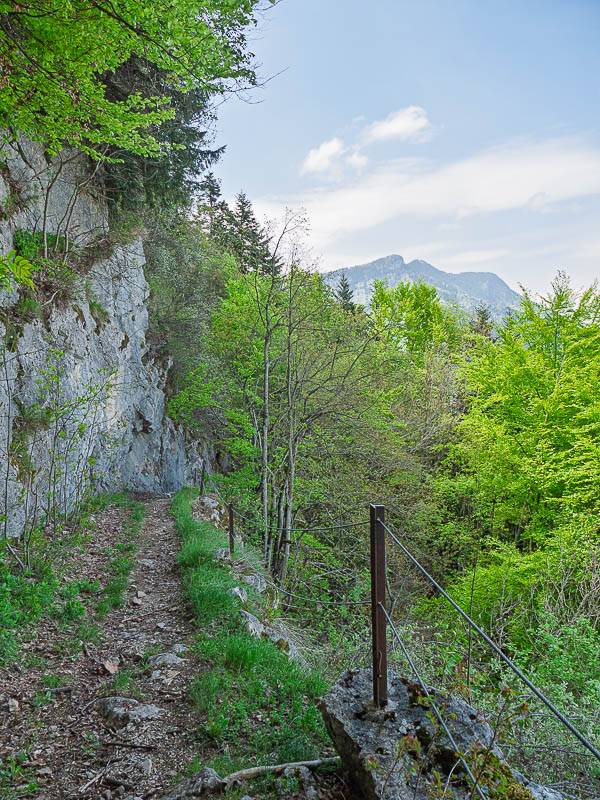 La descente se poursuit par le Nivolet, où l'on quitte la piste au point coté 1039m [ 32T 0268310 5067863 ] pour prendre un superbe sentier qui emprunte bientôt un passage taillé dans la roche d'une falaise protégé du vide par une rambarde. Bientôt au Rosset, l'itinéraire de montée permet un retour tranquille vers le point de départ.