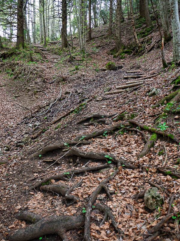 Un escalier de racines et de rondins franchit la dernière pente raide sous le Col de la Cochette (Bauges occidentales, Saint-Offenge-Dessus, Savoie – 19/05/10)