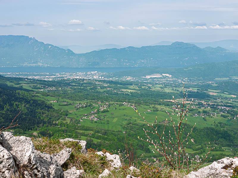 Aix-les-Bains et le Lac du Bourget depuis la table d'orientation de la Cochette, la Dent et le Col du Chat, la Charvaz ferment le paysage (Bauges occidentales, Saint-Offenge-Dessus, Savoie – 19/05/10)