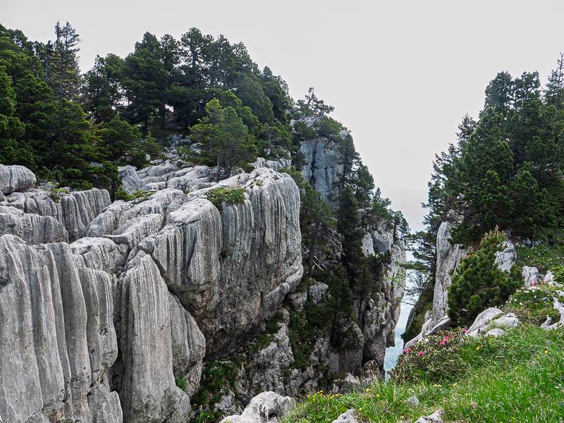 Déjà sous des formations importantes de cumulus bourgeonnant, Belledonne et les massifs lointains restent noyés dans une brume épaisse. C'est l'occasion de s'intéresser aux lapiaz et crevasses profondes qui bordent la crête. L'appareil photo aide à mémoriser les fleurs nombreuses en vue de prochaines séances d'identification, séances d'herborisation numérique, jusqu'au Col de Belles Ombres – un des endroits rangés parmi les quelques uns qui ont ma préférence dans les montagnes de la région.