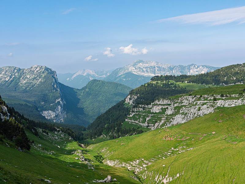 Au dessus des ruines du Habert de Valfroide, C'est en se retournant que l'on découvre la Chartreuse au delà du Cirque de Saint-Même. La Crête de la Forêt Fendue commence la longue barrière des Lances de Malissard. Le Charmant Som apparaît dans l'ouverture du Col de Fontanieu. Le Grand Som domine la paysage sous quelques cumulus matinaux.