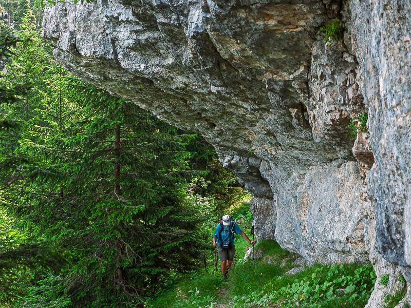 La sente de la doline du Grand Glacier sous les encorbellements de la falaise (Chartreuse orientale, Entremont-le-Vieux, Savoie - 13/07/10)