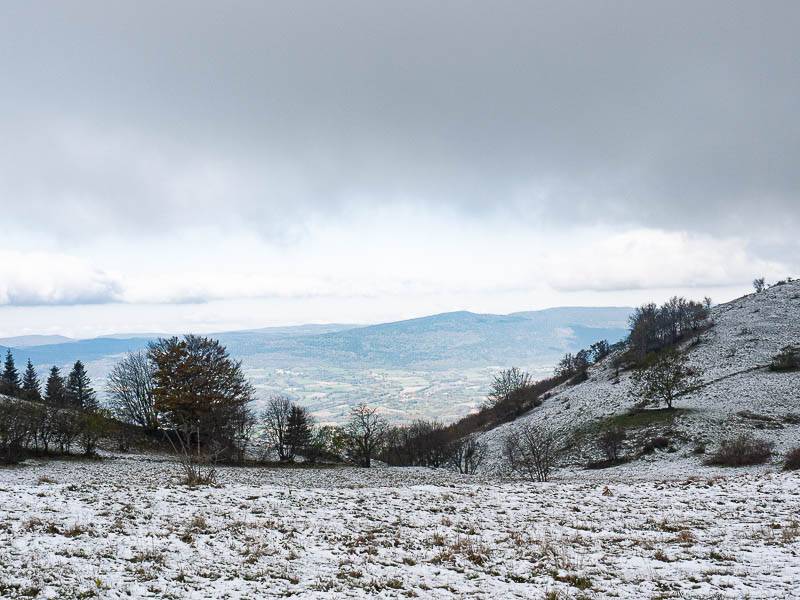 Au loin, le paysage ensoleillé contraste avec l'alpage d'En Pryse couvert d'une mince couche de neige, sous le nuage épais qui ne se dissipera pas de la matinée (Bas Bugey, Béon, Ain - 26/10/10)