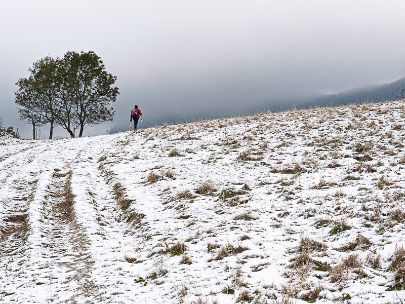 Cette fois encore, nous n'explorerons pas la sente du versant Est. Elle se poursuit au delà de la brèche pour atteindre une faiblesse de la barre rocheuse. Le passage exposé permet probablement de prendre pied sur la terrasse herbeuse qui marque le bout de la montagne. Au bord de la brèche qui nous sépare de l'extrémité de la crête, demi-tour immédiat pour marcher maintenant face au vent glacial qui n'a pas faibli. Même superposées, deux polaires laissent filtrer l'air glacial. Le sol enneigé ajoute à l'ambiance hivernale. Toujours face au vent, suivre le sentier d'En Pryse est une épreuve qui nous aguerrit avant d'affronter le prochain hiver.