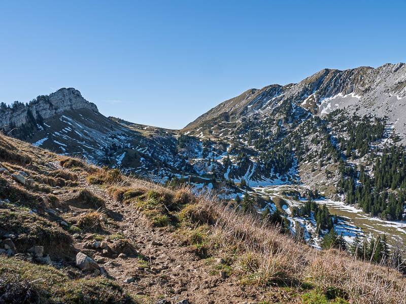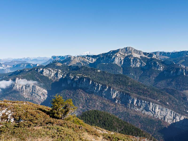 Sous un ciel sans nuage, le paysage révèle toute son étendue. Les lointains, clairs et enneigés, sont magnifiques et, il faut se dépêcher d'en profiter sachant déjà que la prochaine semaine sera pourrie. Vers 1300 m, la mer de nuage couvre l'Avant Pays Savoyard et le Nord du département de l'Isère jusque loin à l'horizon.