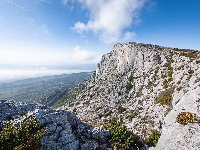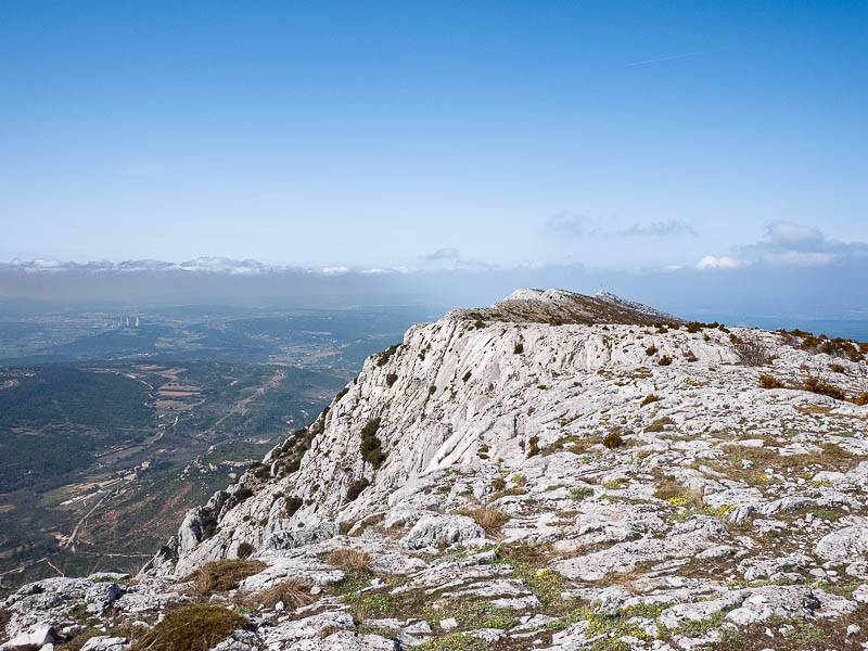 L'environnement très minéral rappelle les crêtes des massifs calcaires fréquentés habituellement. L'atmosphère très sauvage du lieu en me réjouissant, permet d'oublier très vite la rude montée. Le Baù des Vespres, sommet de la Montagne Sainte-Victoire, impose sa falaise dans le tour d'horizon que je ne me lasse pas de parcourir.