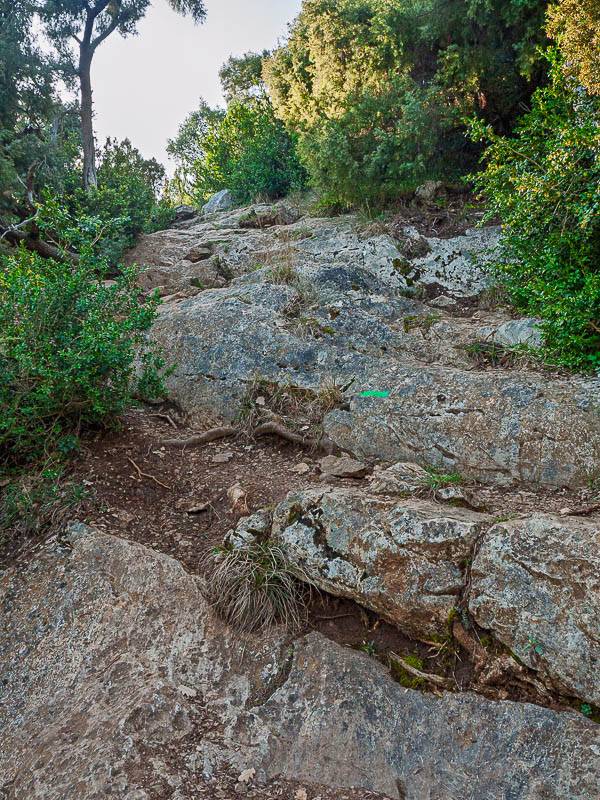 Jusque là tranquille, la pente se redresse vraiment. Le sentier sinueux s'élève fortement, souvent par des passages rocheux escarpés. Il est encore tôt et la fraîcheur matinale du versant Nord stimule la marche seulement couvert d'un simple sweat.