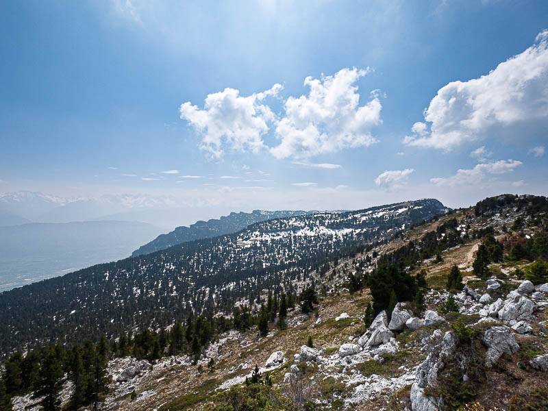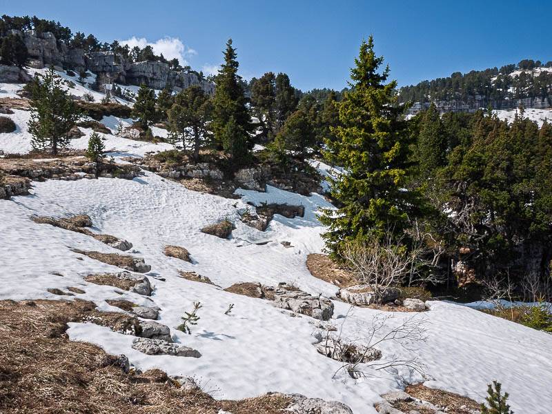 Au-dessus de la falaise principale qui ceinture la montagne, je m'attarde dans le versant Sud à la recherche d'une trace qui marquerait un passage en direction du Sud Ouest, en vain. La barre supérieure contourné, la neige est toujours bien présente dans le versant Nord… Évidemment, c'est le peu qu'il reste dont il faut s'étonner à cette époque de l'année. Mais encore une fois, le projet initial est contrarié. En couche épaisse, la neige mouillée ne porte pas et empêche la suite de mon projet à la Tête du Lion depuis la ruine. Mais plus contraignante, elle rend dangereuse la traversée de l'Alpette, par la Fontaine Neuve jusqu'au Pas de la Porte. En contournant les accumulations de neige, je tente plusieurs cheminements, mais les crevasses des lapiaz sont nombreuses sur le plateau. Renoncer, mais quelle solution ? Passer par le sommet du Granier…