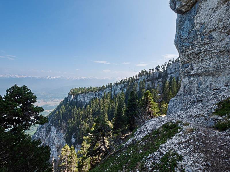 La forêt s'est éclaircie, le tapis de feuilles mortes disparu, laisse maintenant voir le sol nu, du sentier bien sec. C'est rassurant pour s'engager sur la corniche, large sangle découvert au dessus des falaises. La sensation du vide est parfois forte en l'absence de végétation, mais le cheminement reste toujours facile.