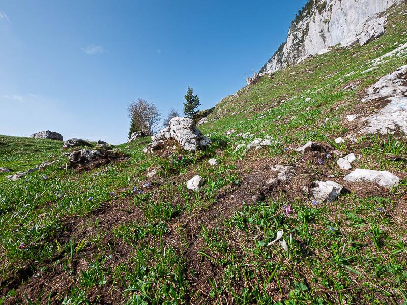 Un corridor encaissé et pittoresque monte vers la sortie sur l'alpage. La lumière vive surprend. Les crocus égaient l'herbe verte qui remplace celle jaunie de l'année passée. Un cri de marmotte lance l'alerte ! Le premier de la saison. Le sentier rejoint le pied de la barre rocheuse qu'il va suivre jusqu'au départ du Pas des Barres marqué d'un poteau indicateur.