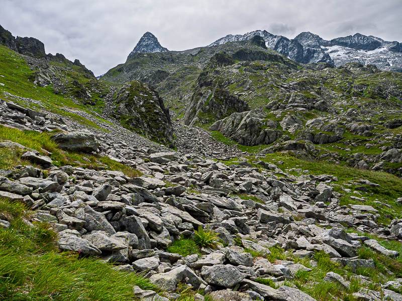 Sur le replat, vers 1760m nous cherchons le sentier. Un cairn éboulé marque le point relevé sur la carte [ 32T 0270666 5016262 ]. Mais rien ! Même pas une trace. En surveillant le GPS, nous nous engageons dans l'herbe chargée d'eau. Cette fois, j'ai enfilé les guêtres mais elles ne serviront pas à grand chose. L'humidité pénètre par capillarité pour descendre jusqu'au fond des chaussures…