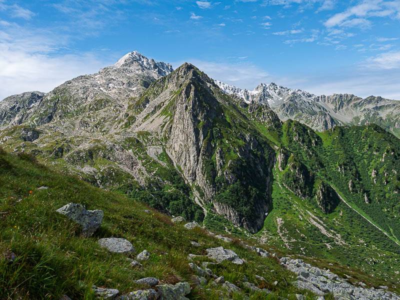 Depuis les pentes des Pointes du Mouchillon, le Roc du Pendet au premier plan, le Pic des Cabottes sur la gauche, la Dent du Pra, la Cime de la Jasse au fond à droite (Belledonne Sept-Laux, La Ferrière, Isère - 25/07/11)