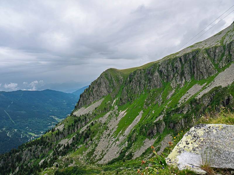 Reprenant la marche sous quelques gouttes, bientôt aux ruines du Chalet des Deux Ruisseaux, nous franchissons le ruisseau issu des lacs par un beau pont de pierres sèches, taillées pour les piliers, de larges dalles pour le tablier. Suivant d'abord le sentier des Deux Ruisseaux, le vieux chemin qui coupe le versant ne tombe pas sous le pied pour éviter du même coup une bonne centaine de mètres de dénivelé. Peu pratiqué, sauf par les moutons, après quelques mètres, il est encore bien tracé. Mais le passage ancien est bien érodé, presque disparu après avoir dépassé les câbles du monte-charge EDF. La pluie nous rattrape dans la descente du Tour du Pays d'Allevard. Cape pour l'un, veste pour l'autre, nous ne quitterons plus les vêtements de protection jusqu'à Fond-de-France. Descendant la rive gauche de la vallée, la vue est occupée par le paysage de la Croix de Chaurionde et son raide couloir. Sous la lumière tamisée du début de l'après midi, le relief des lacets du chemin taillé dans les pentes raides est bien lisible. Et dire que sur place, rien ou presque n'est visible…