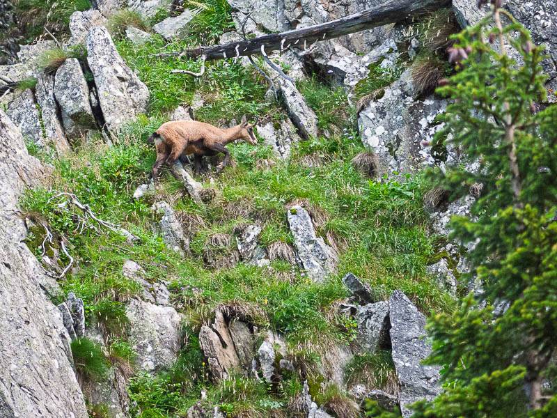 La croupe herbeuse, laisse à l'Est un petit vallon occupé par une demi douzaine de chamois. Surprises par notre présence, le femelles vont fuir prestement en dehors de notre vue. Deux mâles restent paisibles dans la combe.