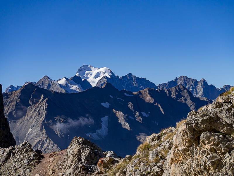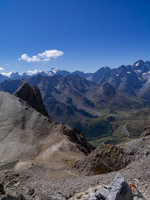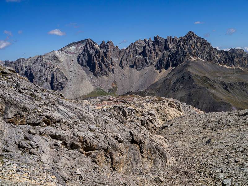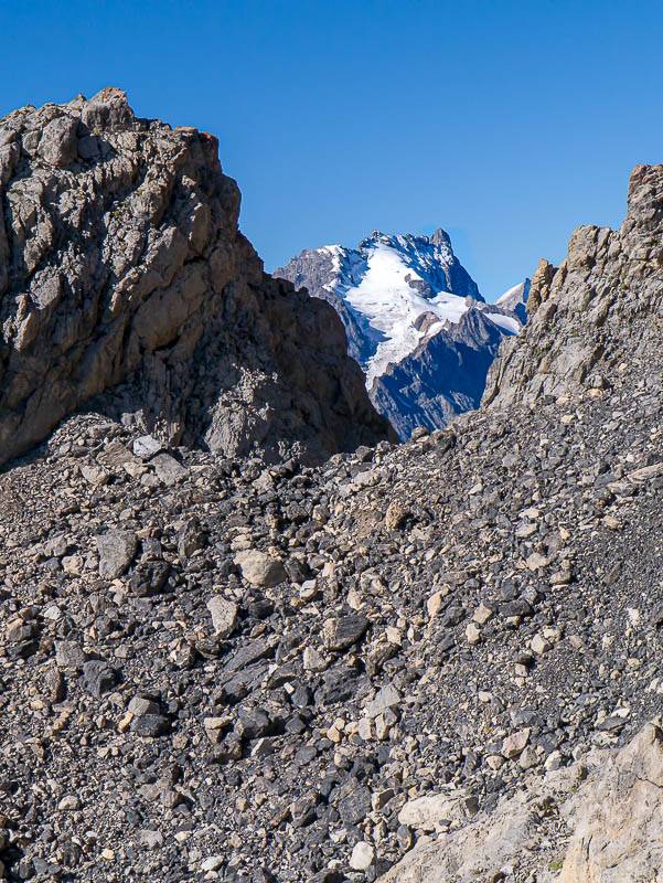 Une petite traversée rattrape une ligne de cairns qui remonte le fond de la combe pierreuse, franchit un verrou étroit entre des rochers, traverse encore à gauche pour se rapprocher de la crête. Et puis plus rien… Sauf la vue splendide sur la Barre des Écrins au delà des Combeynots.