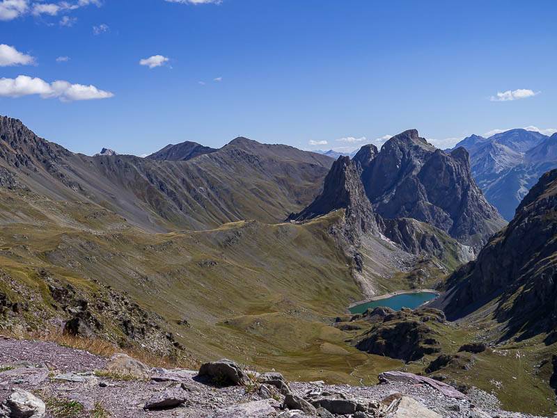 Au Col de la Ponsonnière, le Grand Lac au pied des Arêtes de la Bruyère devant la belle Aiguillette du Lauzet (Massif des Cerces, Galibier-Peyrolle, Valloire, Savoie - 10/09/11)
