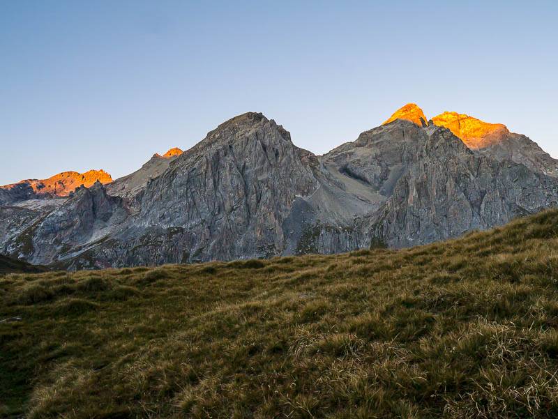 Pas un seul nuage dans le ciel clair ne vient gâcher un lever de soleil qui vient éclairer de sa lumière chaude, le Grand Galibier et les Aiguilles d'Arves d'abord. Depuis le départ, le vent fort rafraîchit un peu plus, l'air déjà frais. Dans ces conditions, le Col de la Ponsonnière est rapidement atteint, alors que les premiers rayons du soleil projettent l'ombre qui m'accompagnera tout au long de la journée.