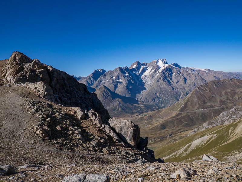 Le Lac Termier contourné, la vue sur la Meije se dégage rapidement en montant la combe pierreuse (Massif des Cerces, Galibier-Peyrolle, Valloire, Savoie - 10/09/11)