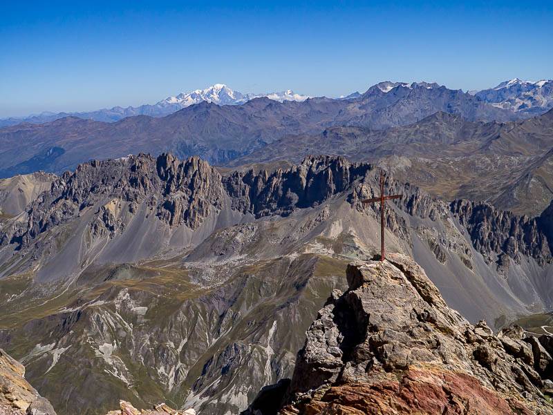 Et puis, encore quelques mètres permettent d'atteindre la plateforme sommitale. Une antenne dressée là, ne retient pas vraiment l'attention, le paysage est magnifique sur 360°. Les Écrins, Rochebrune, Viso, Grandes Rousses, Mont Blanc bien sûr, Vanoise, etc. captent le regard au loin, et plus près, l'inventaire donne une grande satisfaction.