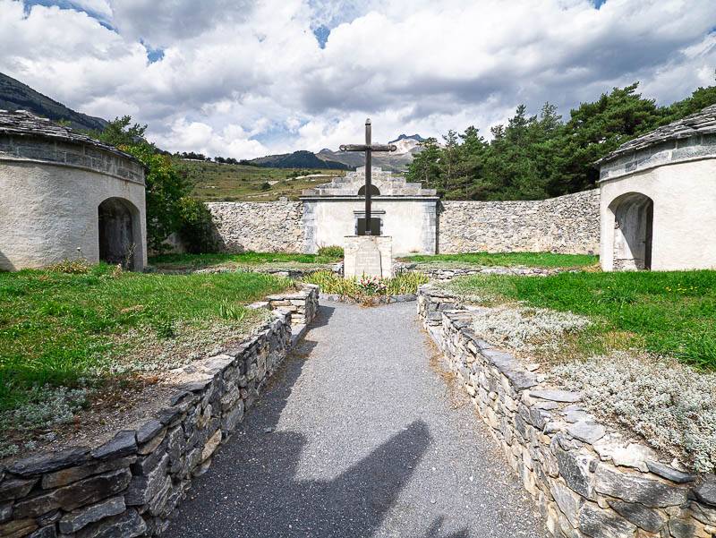 L'ancienne route des forts passe à proximité du cimetière sarde. Destiné à accueillir les défunts de la garnison et du village de l'Esseillon, le plan du cimetière est parfaitement symétrique, organisé autour du calvaire central. Les deux reposoirs latéraux étaient destinés à abriter les morts pendant l'hiver, lorsque la terre gelée interdisait toute sépulture… (Maurienne, Aussois, Savoie – 11/09/11)