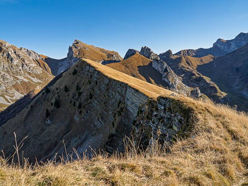 Sur le fil, la sente reste fidèle au bord de l'à pic à gauche, en pente plus douce à droite. Mais de ce côté de la crête, des barres rocheuses se devinent quelques dizaines de mètres en contrebas. Les passages se succèdent, pas bien méchants certes, mais la prudence est de mise.
