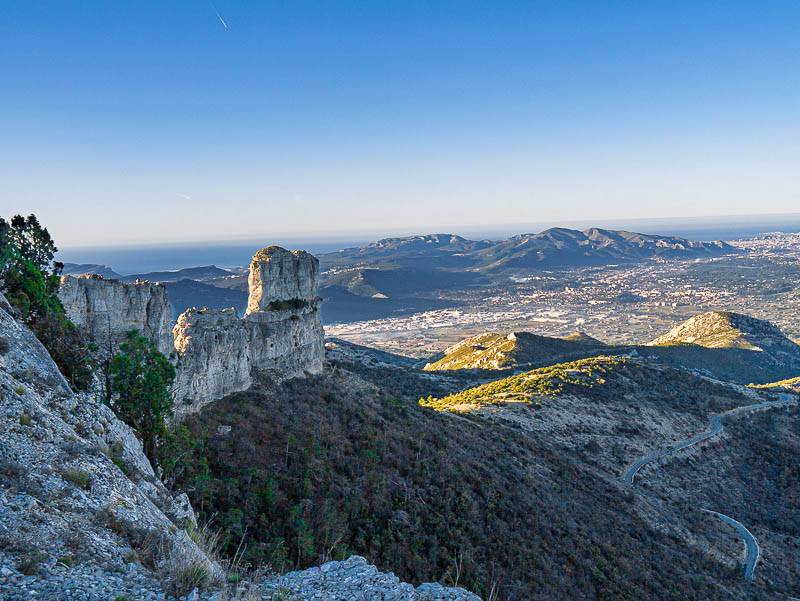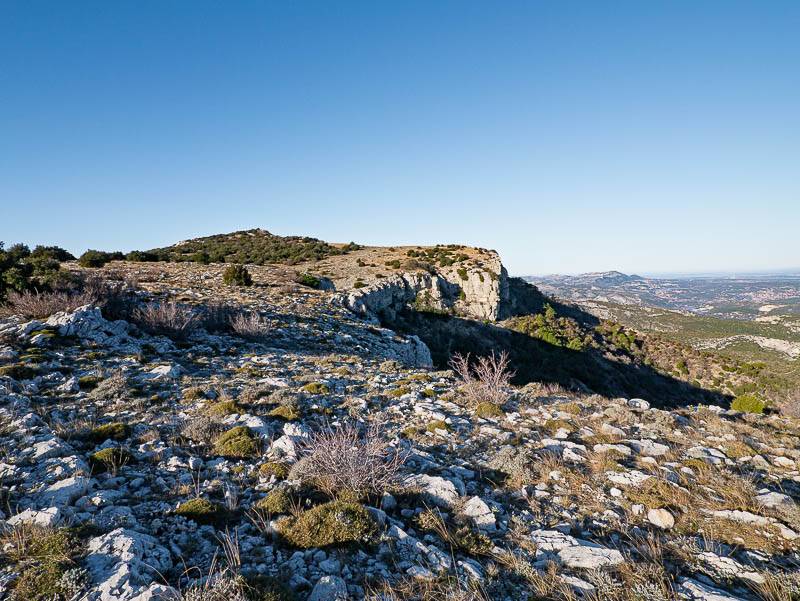 La crête des Dents de Roque Forcade domine la plaine d'Aubagne, face à Marseille et à la Méditerranée, au loin (Provence, Plan-d'Aups-Sainte-Baume, Var – 28/12/11)