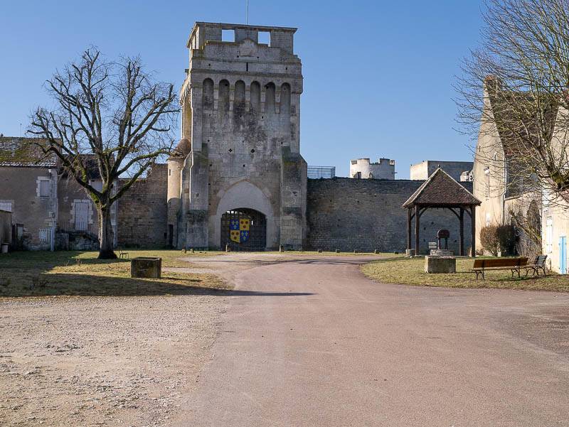 Le retour par la place du château, son tilleul et la magistrale poterne, unique entrée au château. Le blason de la maison de Courtenay est peint sur le portail de la tour (Bourgogne, Druyes-les-Belles-Fontaines, Yonne – 29/02/2012)
