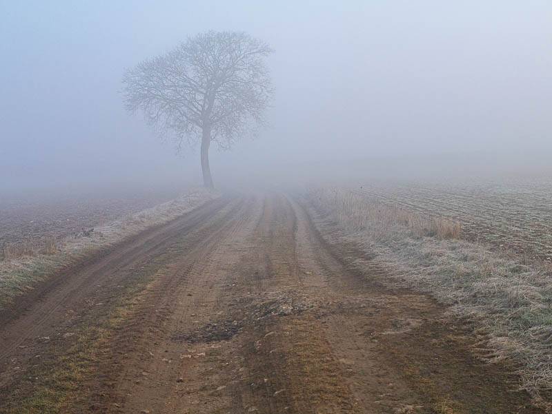 Dans le brouillard épais, un arbre rompt la monotonie du paysage sur le chemin de la butte des Grosses Coudres (Bourgogne, Druyes-les-Belles-Fontaines, Yonne – 29/02/2012)