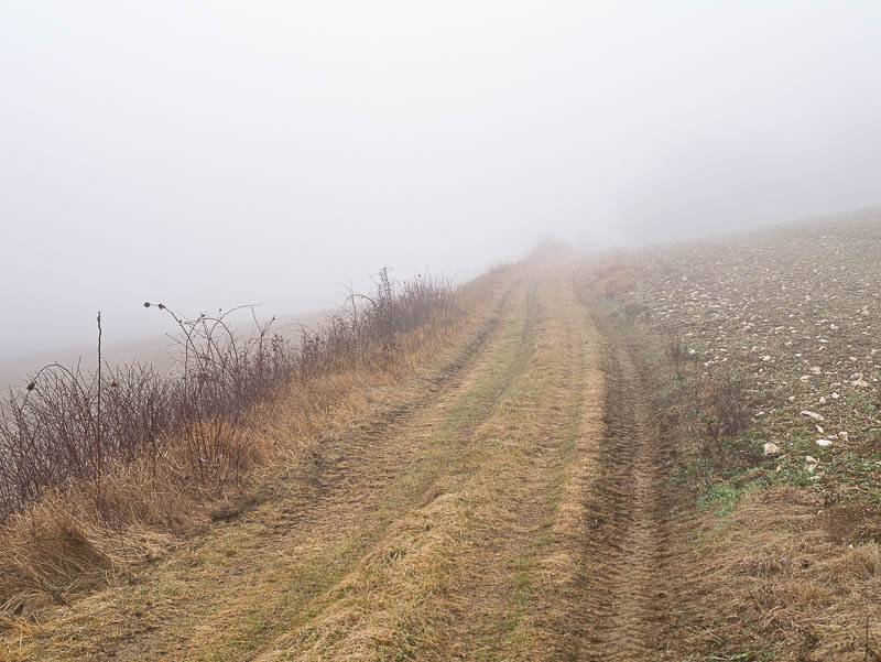 Ce matin encore le brouillard omniprésent ralentit la conduite sur la départementale D104, qui relie Druyes-les-Belles-Fontaines à Courson-les-Carrières. Si le départ de la randonnée est à Molesmes, la route coupe l'itinéraire à Villepot au point 265. La voiture est stationnée à proximité d'un abribus en parpaings [ 31T 0535576 5271032 – N 47.59172° E 3.47320° ]. Le GPS soigneusement programmé la veille, sera d'une aide précieuse aux bifurcations qui jalonnent le circuit. Mais la longue marche devient fastidieuse, sans aucune vue sur les lointains et je retrouverais le point de départ sans une éclaircie.