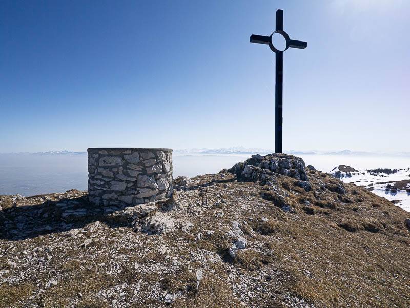La table d'orientation qui facilite la lecture et la croix érigées au sommet du Crêt de la Goutte (Haut-Jura, Confort, Ain – 15/03/12)