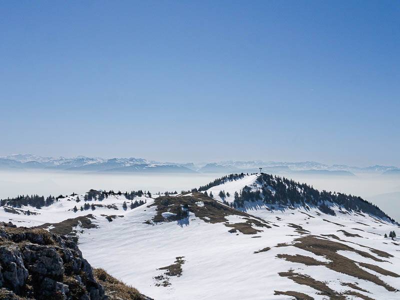 En cassant la croûte, le regard ne peut que suivre les innombrables crêtes, l'une après l'autre. Et puis, le voile se clarifie encore un peu. Seul le Lac Léman, le Pays de Gex, Genève se devinent à peine dans la brume.